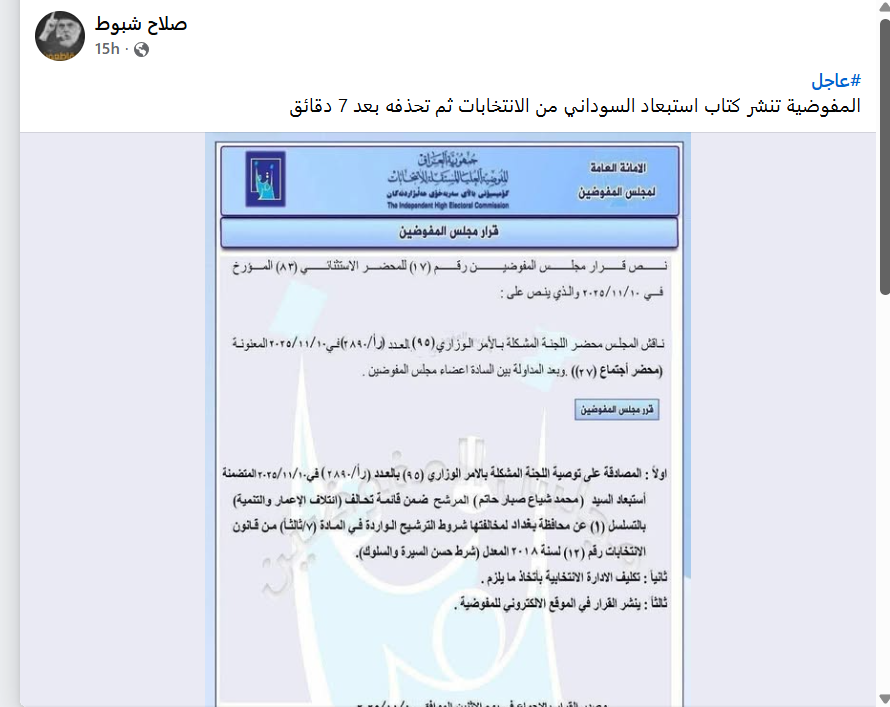 تحرى فريق "تفنيد" حول الادعاء المتداول في مواقع التواصل الاجتماعي، في 10 و11 نوفمبر 2025، حول محضر استثنائي لمفوضية الانتخابات تستبعد فيه رئيس الوزراء محمد شياع السوداني من الانتخابات، ثم تحذف القرار من قناتها على التلغرام بعد دقائق. واكتشفنا أنه "غير صحيح"، بحسب موقع المفوضية العليا المستقلة للانتخابات، وكذلك التحليل الفني واللغوي لوثيقة الاستبعاد المتداولة.