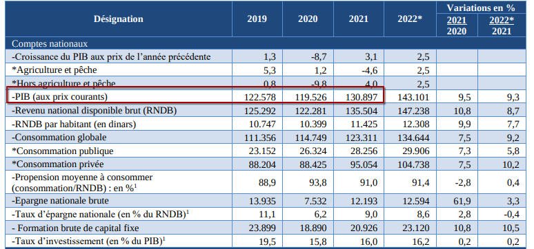 ولمزيد التحقق، عدنا إلى التقارير السنوية للبنك المركزي التونسي، فوجدنا أن الناتج الداخلي الخام لتونس بالأسعار الجارية بلغ 122 مليار دينارًا سنة 2019، ثم انخفض إلى 119 مليار دينارًا سنة 2020، وارتفع بعدها إلى 130 مليار دينارًا سنة 2021.