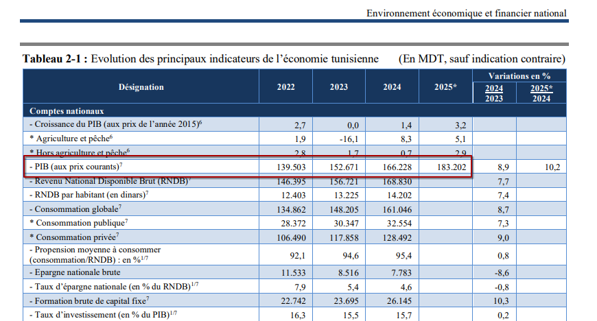 في المقابل وحسب نفس المصدر ارتفع الناتج الداخلي الخام لتونس بحساب الأسعار الجارية فبلغ 41.9 مليار دولارًا سنة 2019، و42.4 مليار دولارًا سنة 2020، ثم 47 مليار دولارًا سنة 2021، لينخفض بعدها إلى 44.9 مليار دولارًا سنة 2022، ثم ارتفع من جديد وبلغ 48.2 مليار دولارًا سنة 2023، و53.4 مليار دولارًا في 2024. وبالتالي فإن الناتج الداخلي الخام لتونس تجاوز مستوى سنة 2019 بحساب الأسعار الجارية.